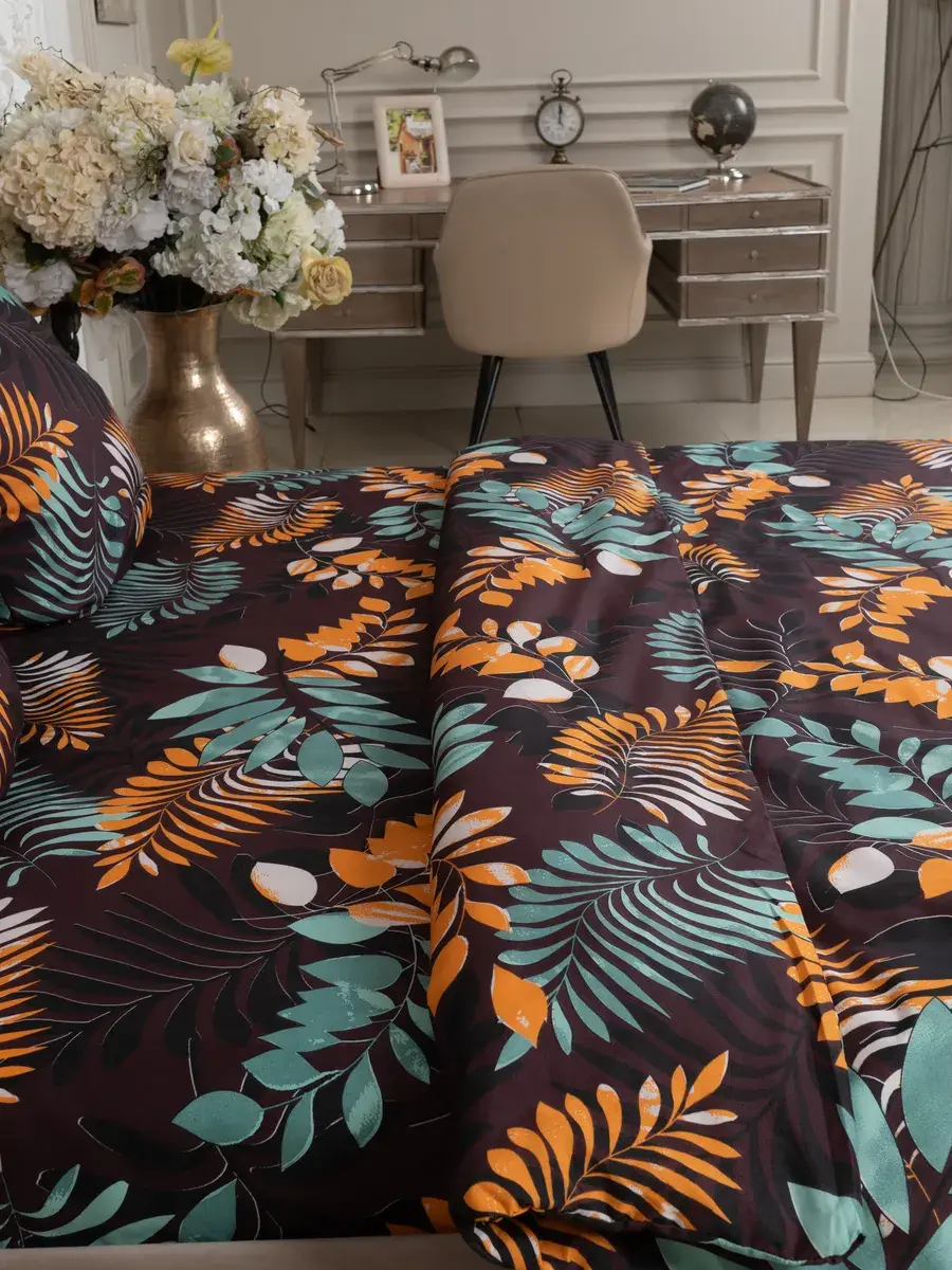 Постельное белье из полисатина имеет наволочки и пододеяльник без застежек, что обеспечивает легкость в использовании и уход за постельным бельем. Рисунок с листьями и растениями придает интерьеру спальни изысканный и уютный вид, делая его местом для отдыха и восстановления сил. Этот комплект постельного белья идеально подойдет как для современных интерьеров, так и для классических.